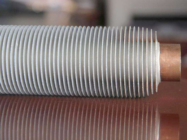 雙金屬?gòu)?fù)合翅片管是銅、鋁管(或鋼管、鋁管;或不銹鋼管、鋁管)經(jīng)復(fù)全后再軋制出翅片,具有結(jié)合緊密、熱阻小、傳熱性能好、強(qiáng)度高、流動(dòng)損失小、防腐蝕性能強(qiáng)、在長(zhǎng)期冷熱工況下不晚變形、工作壽命長(zhǎng)等優(yōu)點(diǎn)。