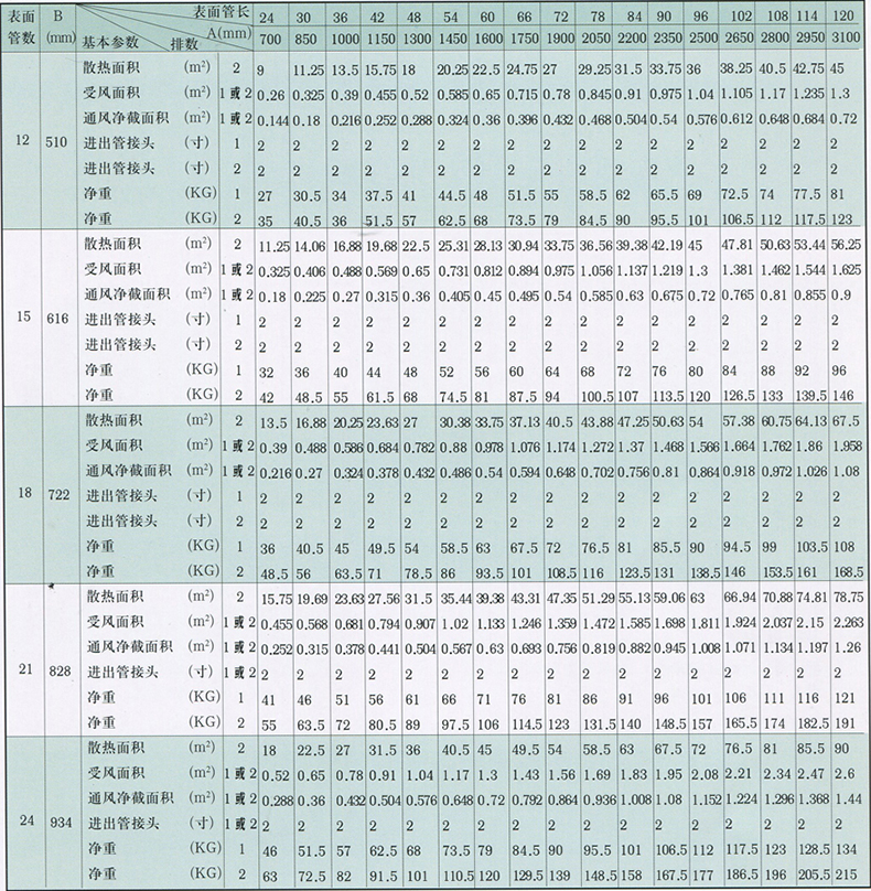 UⅡ型散熱排管有各種不同表面管長、管數(shù)、排數(shù)及翅片片距的多種配合,計(jì)有大小規(guī)格七百六十五種。
